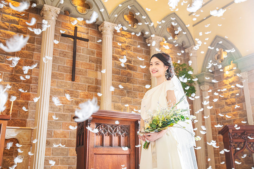 館内にある本格的なチャペルでの撮影が追加料金なしでご利用いただけます。天井高10メートルを誇る県下最大級の大聖堂『聖マリエール大聖堂』で、荘厳な雰囲気の中、おふたりの特別な瞬間を美しい写真に残しませんか。専門結婚式場ならではの充実した設備で、思い出に残るフォトウェディングをお手伝いいたします。